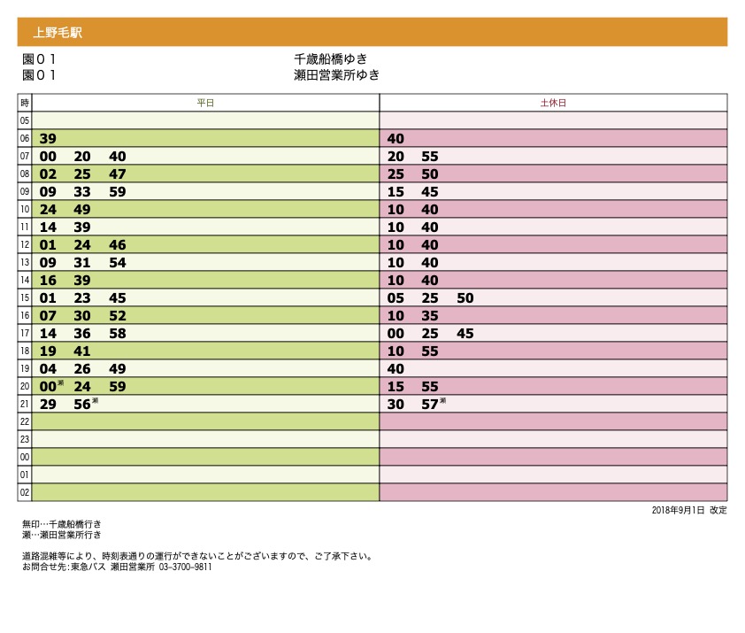 ↓上野毛駅から(系統:園01) 千歳船橋駅または瀬田営業所ゆき